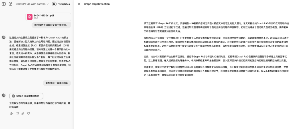 例如:我们上传一篇论文,请GPT帮忙概括。GPT概括后并不会立即展开画布。随后,我们要求GPT就同一篇论文输出读后感。这时,GPT输出完毕后会自动展开到画布编辑模式。