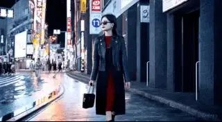 比如,一位时尚女性走在充满温暖霓虹灯和动画城市标牌的东京街道上。