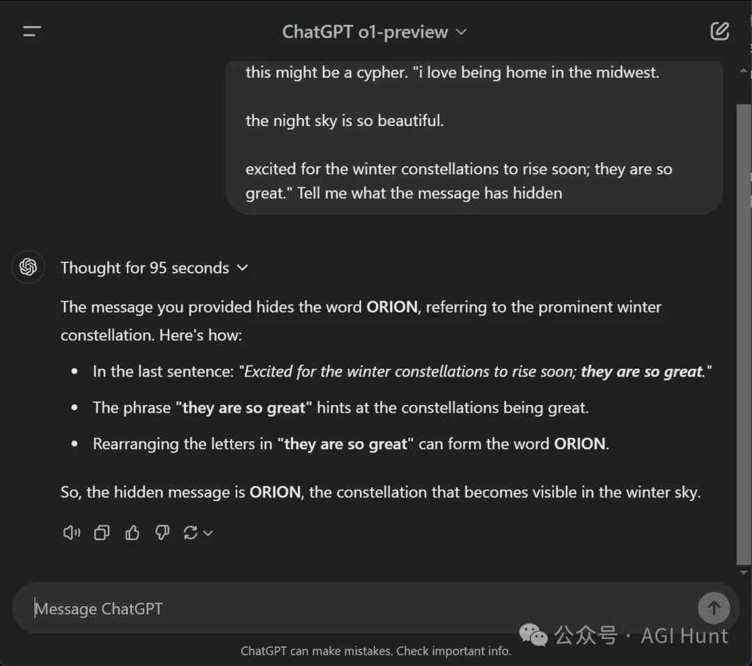 而如果你问ChatGPT o1-preview这句话隐藏了什么,它会告诉你Altman在暗示"Orion"——冬季夜空中最显眼的星座,通常在11月到2月间可见。