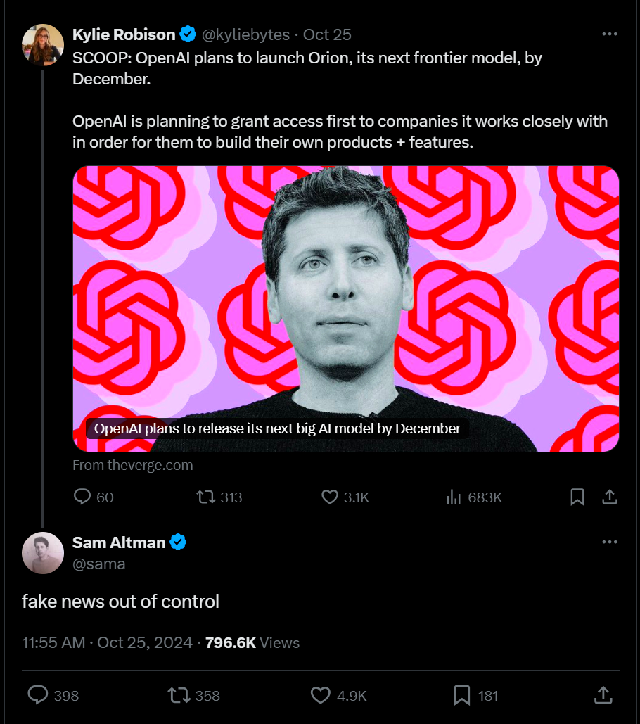 这一时间点与OpenAI首席执行官Sam Altman在X平台上发布的一条神秘帖子相吻合,他在帖子中表示对即将到来的冬季星座感到兴奋。如果你询问ChatGPT o1-preview关于Altman帖子的隐藏含义,它会告诉你他正在暗示“Orion”,这是从11月到2月在夜空中最显眼的冬季星座。