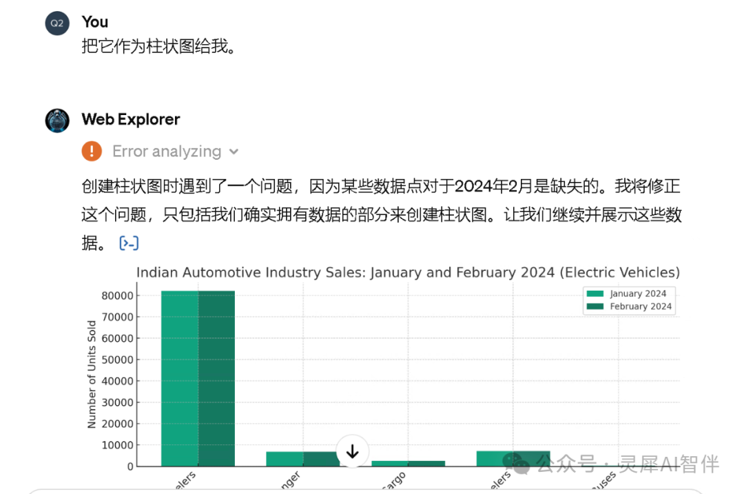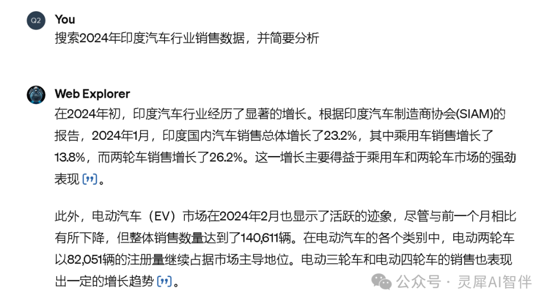 这时,如果我问:“搜索2024年印度汽车行业销售数据,并简要分析”。它就会去web浏览器上搜索这个问题的答案。