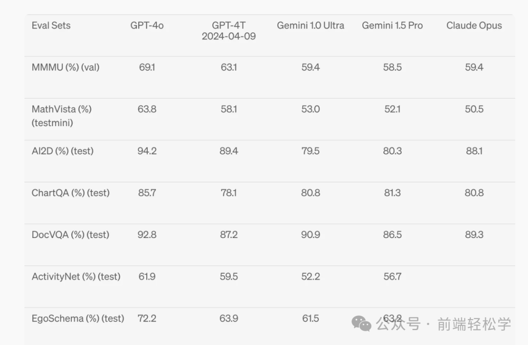 GPT-4o 在视觉感知基准测试中实现了最先进的性能。全面碾压之前的模型。所有视觉评估均为 0 次,其中 MMMU、MathVista 和 ChartQA 为 0 次 CoT。