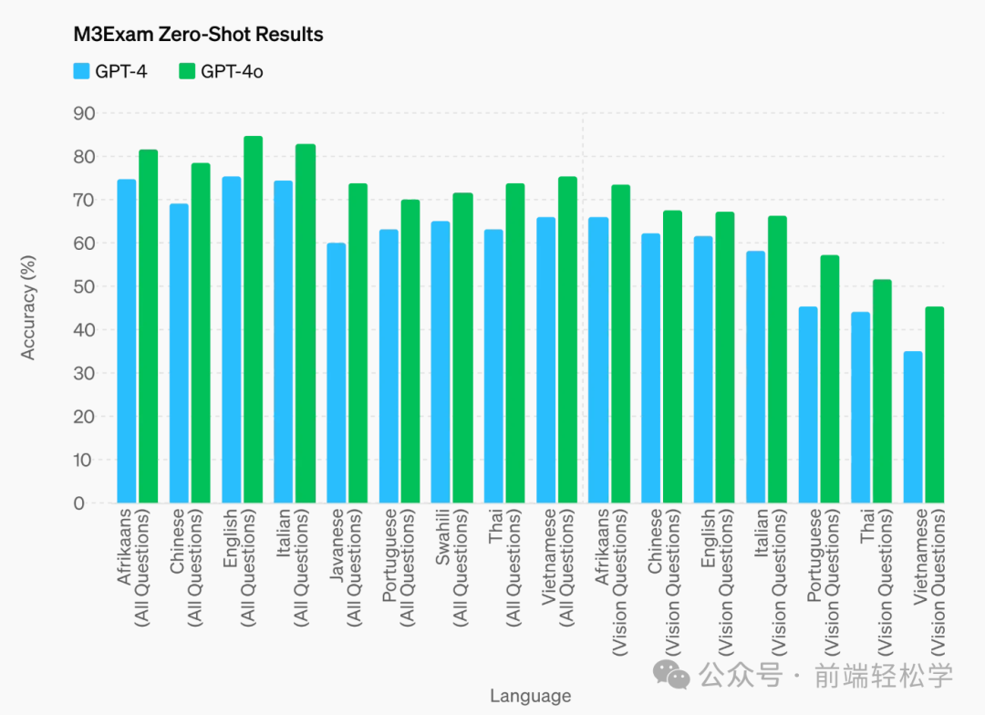M3Exam 基准测试既是多语言评估,也是视觉评估,由来自其他国家标准化考试的多项选择题组成,有时包括数字和图表。GPT-4o 在所有语言的基准测试中都比 GPT-4 强。(我们省略了斯瓦希里语和爪哇语的视力结果,因为这些语言只有 5 个或更少的视力问题。)