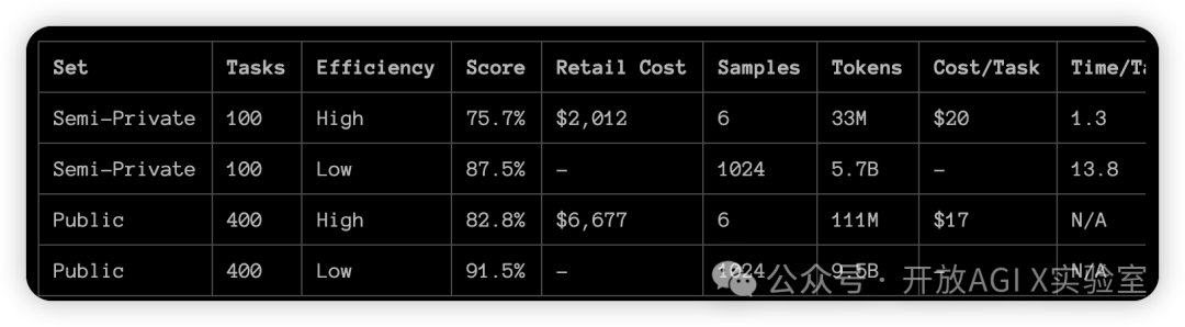 75.7% 的高效率得分符合 ARC-AGI-Pub 的预算规则(成本 < 10,000 美元),因此有资格在公共排行榜上名列第一!