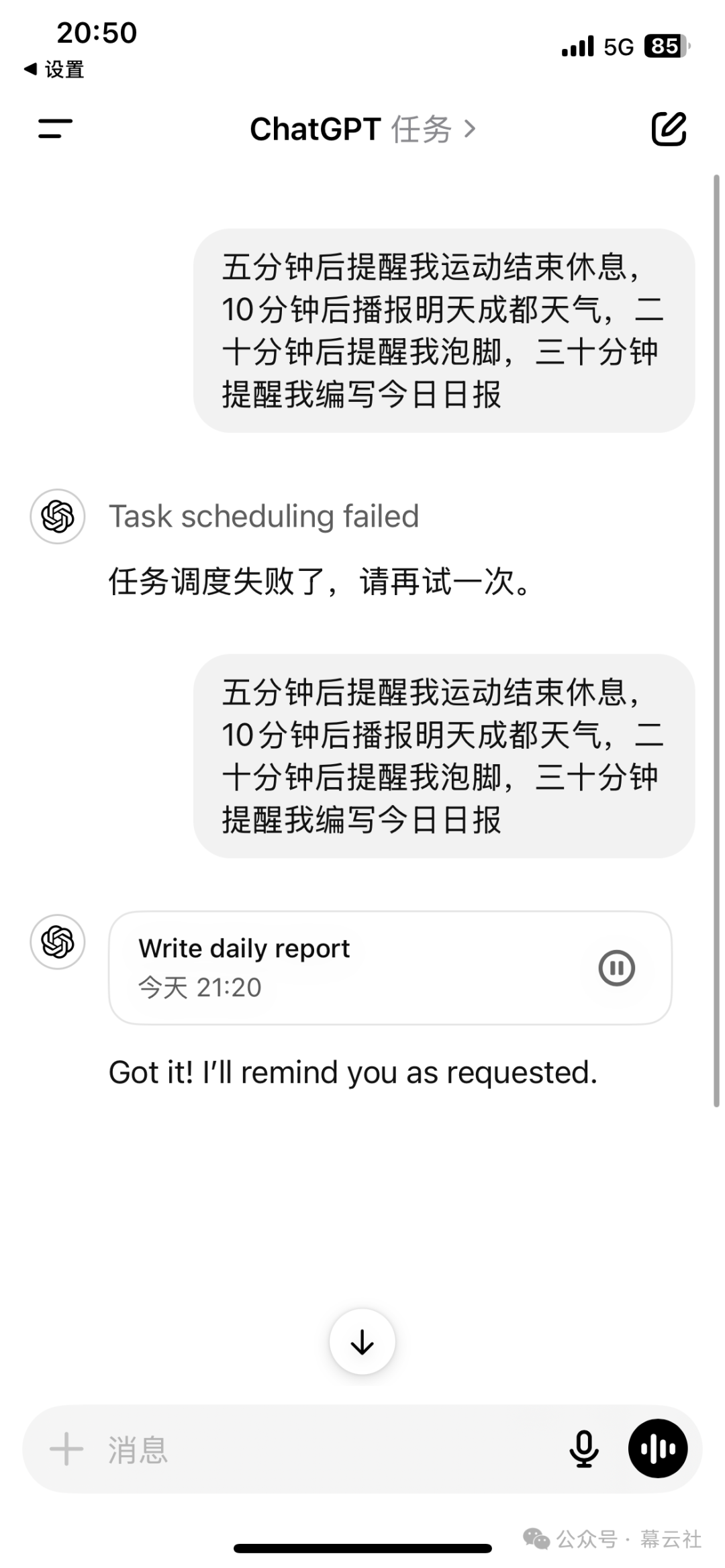 值得注意的是,任务功能目前仅支持单一任务的设置,如果在一段对话中包含多项任务,ChatGPT暂时无法自动拆分和执行多个指令,建议用户逐条设置任务,以确保指令的准确性和执行效果。