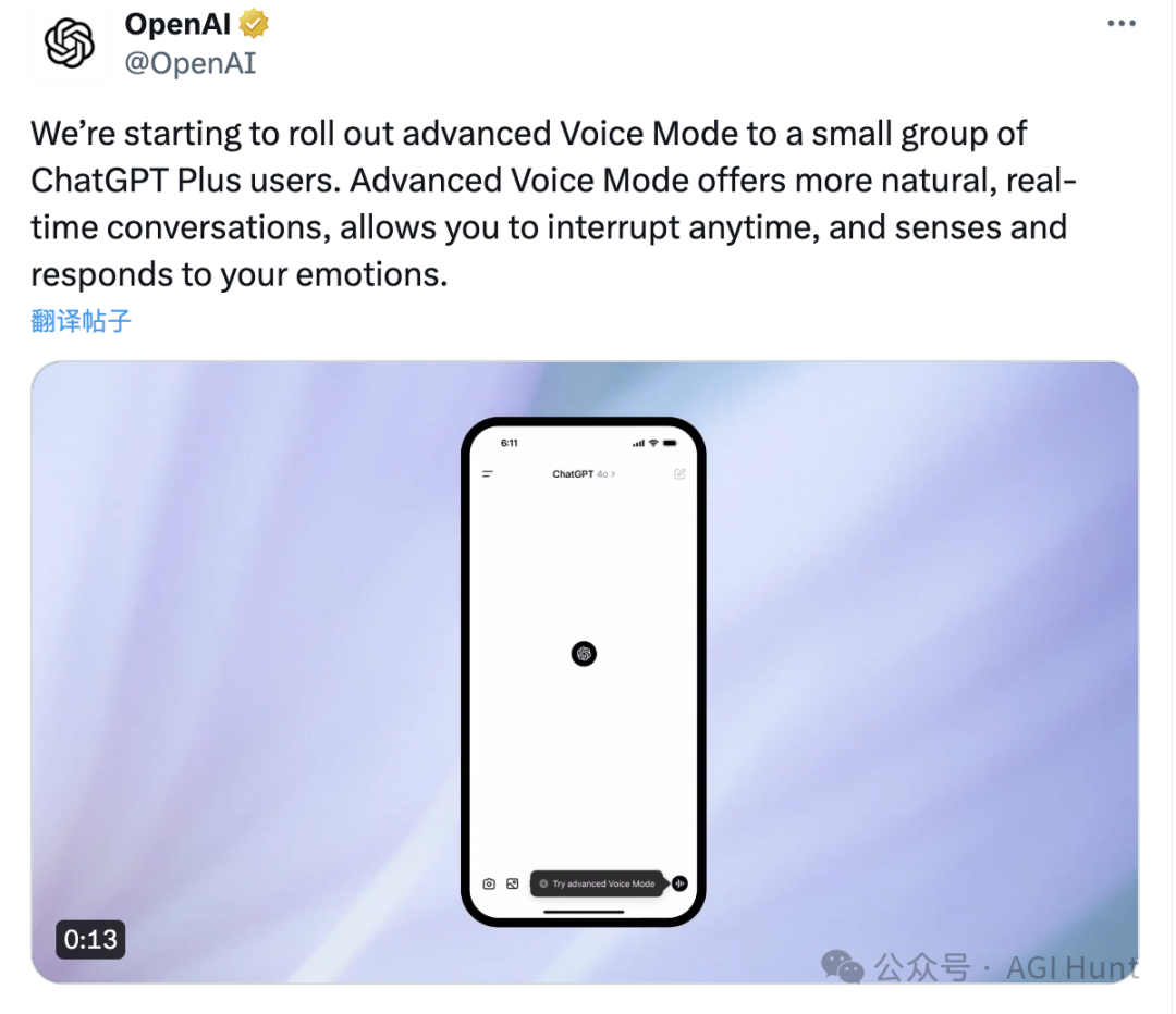 OpenAI官方推特宣布,他们已经开始向少量ChatGPT Plus用户推出高级语音模式的测试版。