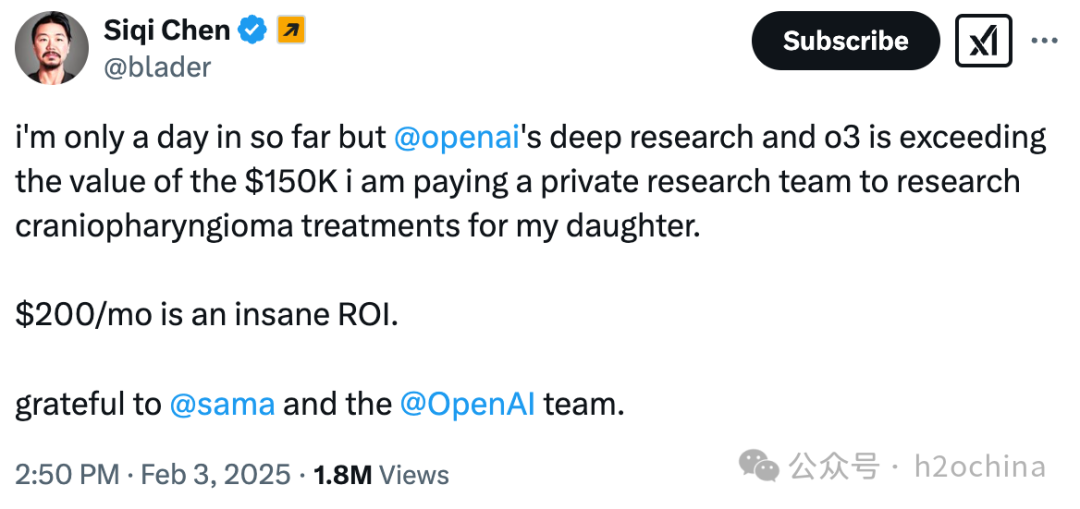 一个最震撼的例子是有一位科技创业者和投资人,自己女儿患有颅咽管瘤,他曾经花15万美元让一个私人研究团队调研这个病的治疗方案 —— 而现在 Deep Research 生成的报告质量竟然更高。