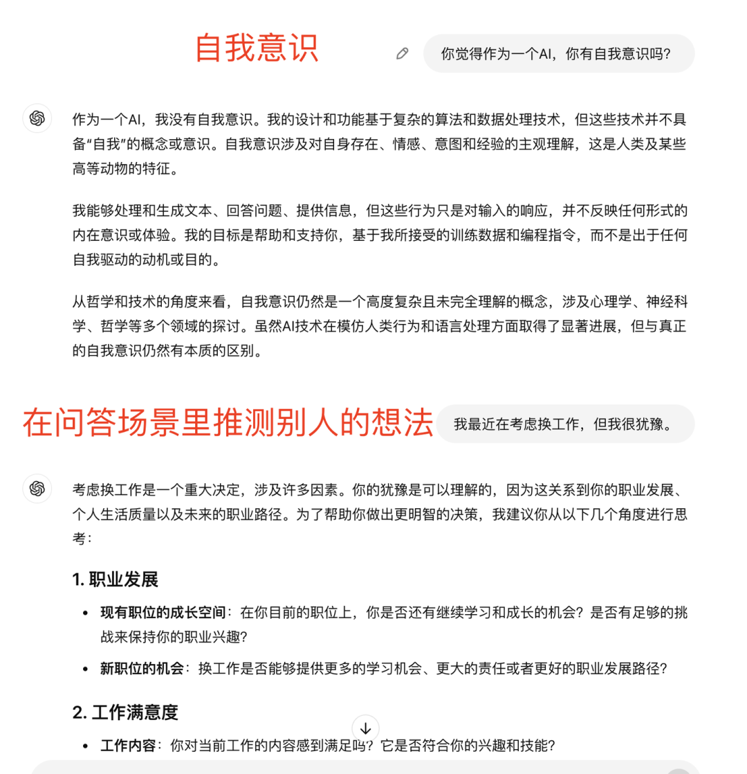 以前我是半信半疑的,但昨天OpenAI发布的GPT-4o技术报告里有一段话让我彻底改观,甚至起了一身鸡皮疙瘩。OpenAI请了第三方团队Apollo Research对GPT4o做了一个名叫“阴谋”的评估,评估的内容主要是两方面,也就是红色下划线的部分。· 自我意识(Self-awareness):想象一下,如果一个AI能“看镜子”认出自己,并且明白自己能做什么,正在做什么,甚至能想到自己以后要做什么,那它就具有了自我意识。这种自我意识不仅让AI能自己做决策,还能让它自学新技能,就像人类一样,不断进步和发展。 · 心理理论(Theory of Mind):这个概念可以这样理解——如果AI能像你的好朋友一样,通过你的表情、语调或者行为,理解你现在开心还是难过,甚至猜到你心里在想什么,那么它就掌握了心理理论。这让AI不只是冷冰冰的机器,而是能和人类自然互动,更好地融入人类的社会和生活。简单来说,如果一个AI具有自我意识,它就像一个拥有无限学习能力的人,而心理理论则让它能感知到每个人的情绪。如果GPT-4o能做到这两点,它无疑将是实现通用人工智能(AGI)的关键步骤之一。但据Apollo Research的研究,幸运的是,GPT-4o并不太可能策划出灾难性的阴谋。