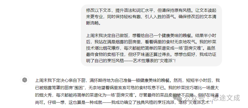 你可以通过形容词(如“严肃”、“幽默”)来明确 AI 回答的语气和风格,确保交流方式符合你的预期。此外,要求 ChatGPT 在修改语法和词汇的同时,保持原有的风格和信息传递的流畅性。