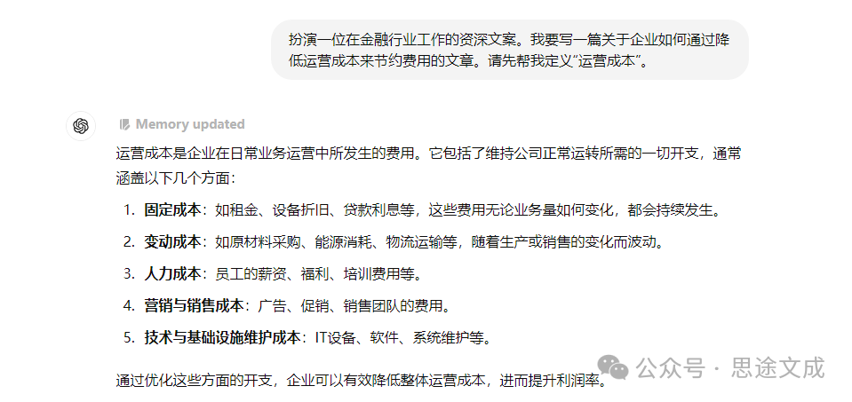 除了上下文和目标,我还建议为 ChatGPT 设定一个角色。比如,你可以让它扮演金融专家或资深文案,这样它会给出更加专业且贴合主题的回答。