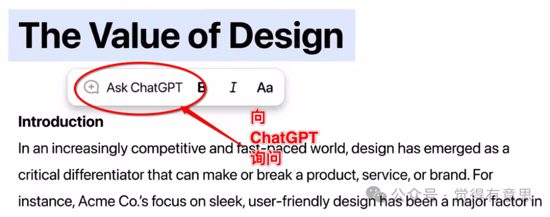 比如下图,选定标题(中文:设计的价值)后会出现向ChatGPT询问的按钮: