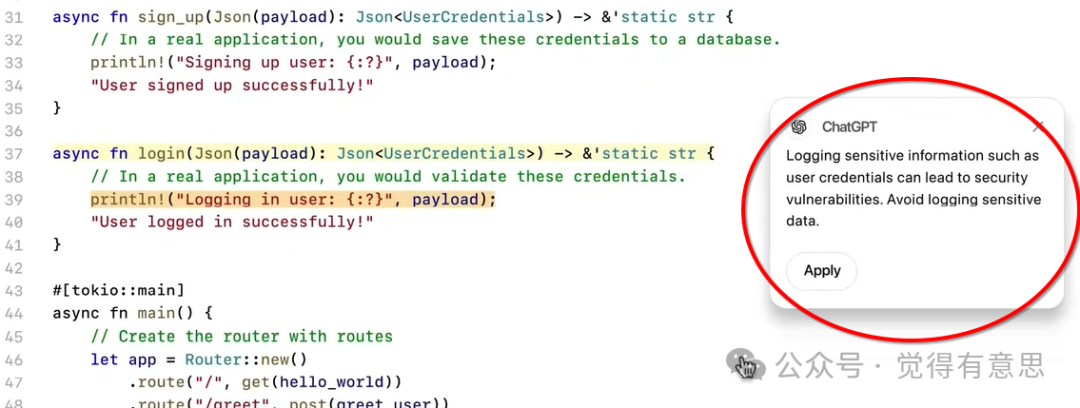 调试代码:如果代码有bug,高亮问题区域,ChatGPT 会提供修复建议,甚至直接帮你改正。