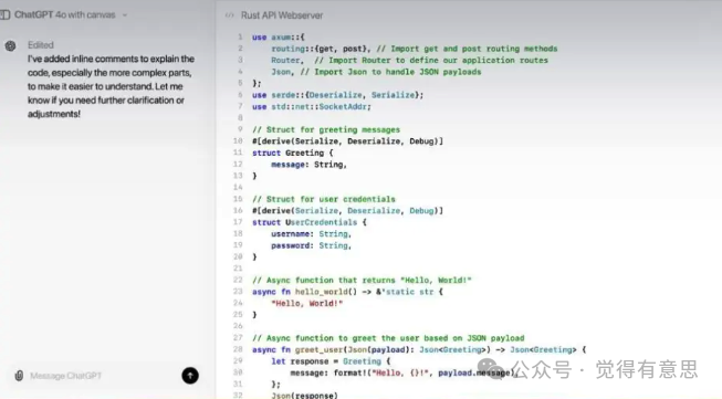 比如,当你需要生成一段代码时,可以直接告诉 ChatGPT:“我需要一个简单的网页服务器。”然后,神奇的事情发生了 —— ChatGPT 在 Canvas 窗口中生成了相应的代码。
