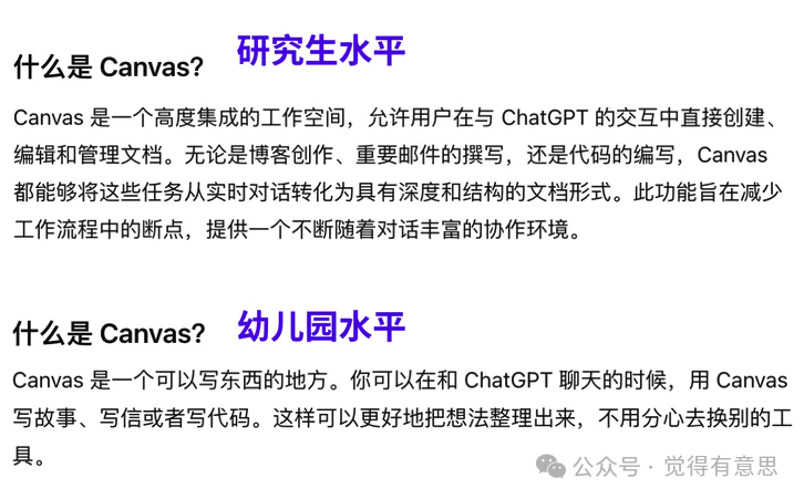 比如上面提到的阅读级别调整,有网友用Canvas的自我介绍做了此“研究生”与“幼儿园”的对比。好吧,差异挺大(希望幼儿园认字......)。