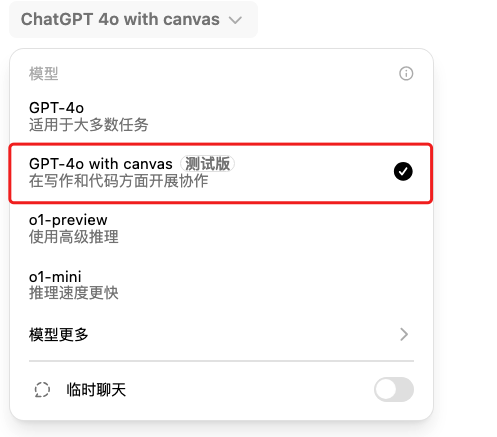 在模型列表中选择【ChatGPT 4o with canvas】