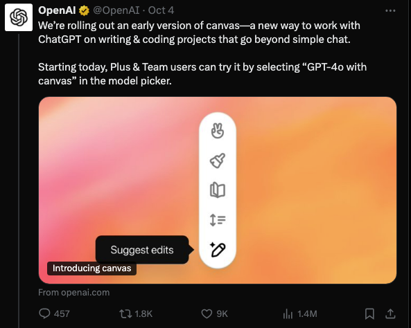 根据OpenAI的官方描述,Canvas 是一个基于GPT-4o 模型构建的全新的交互界面,旨在提升 ChatGPT 在写作和编程项目上的协作体验。