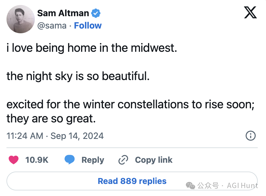 而如果你问ChatGPT o1-preview这句话隐藏了什么,它会告诉你Altman在暗示"Orion"——冬季夜空中最显眼的星座,通常在11月到2月间可见。
