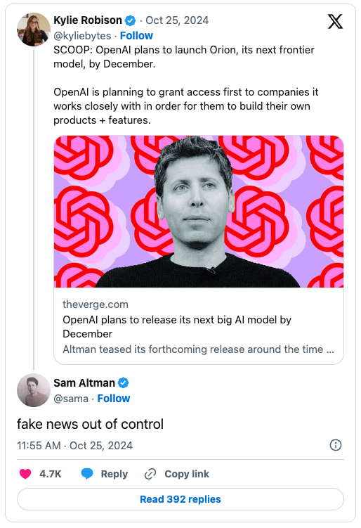 从我所看到的情况来看,Altman 此后并没有做出太多的详细说明,而且他的回应显然不是对这些说法的直接否认——他没有写“不”或“这是错误的”,更不用说描述文章中哪部分是错误的:OpenAI 不是在开发一种名为 Orion 的新前沿模型吗?这与The Information等媒体先前的报道相矛盾,后者称 OpenAI 内部确实有这样的努力——据我所知,OpenAI 从未直接否认过。它不打算在今年晚些时候发布吗?