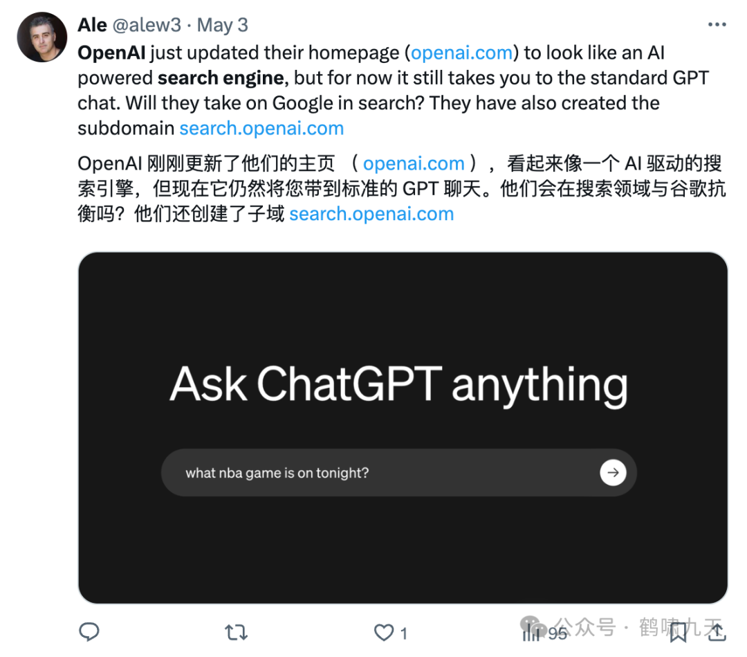 传言OpenAI预计5月9日发布自己的搜索引擎,域名:search.chatgpt.com