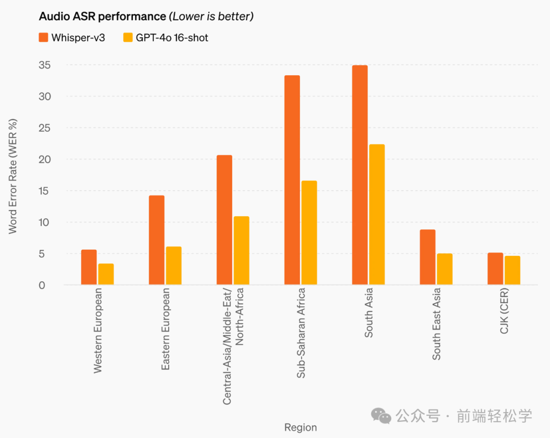 GPT-4o 在语音翻译方面创下了新的领先地位,并在 MLS 基准测试中优于 Whisper-v3。