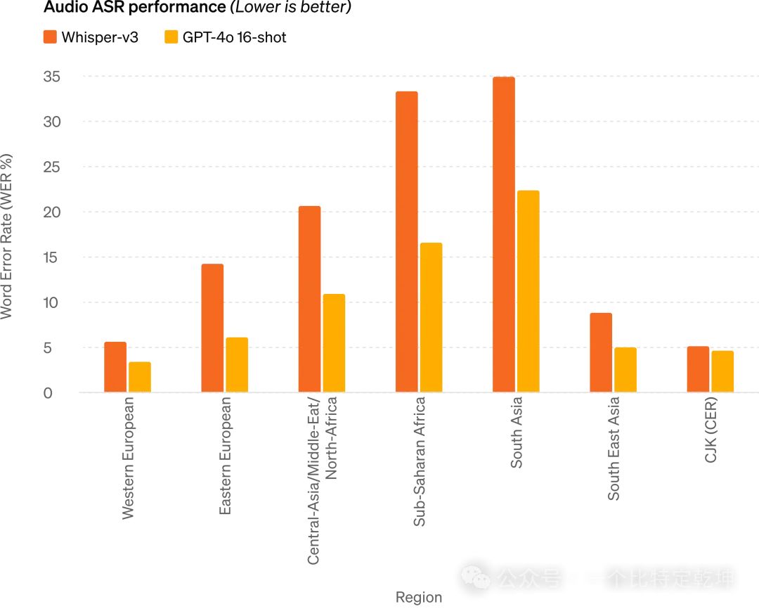 音频 ASR 性能: GPT-4o 比 Whisper-v3 显着提高了所有语言的语音识别性能(特别是对于数据匮乏的语言)