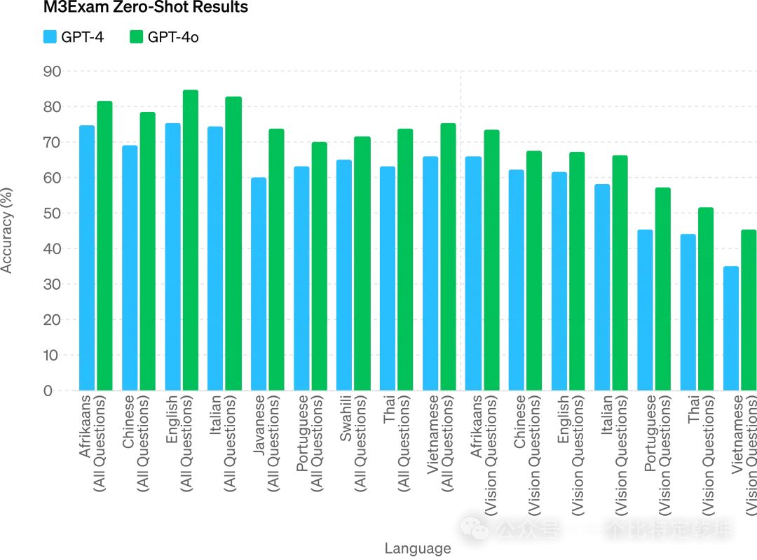 音频翻译性能: GPT-4o 在语音翻译方面创造了新的最先进水平,并且在 MLS 基准测试中优于 Whisper-v3。3.4 M3Exam 零样本(Zero-Shot)结果