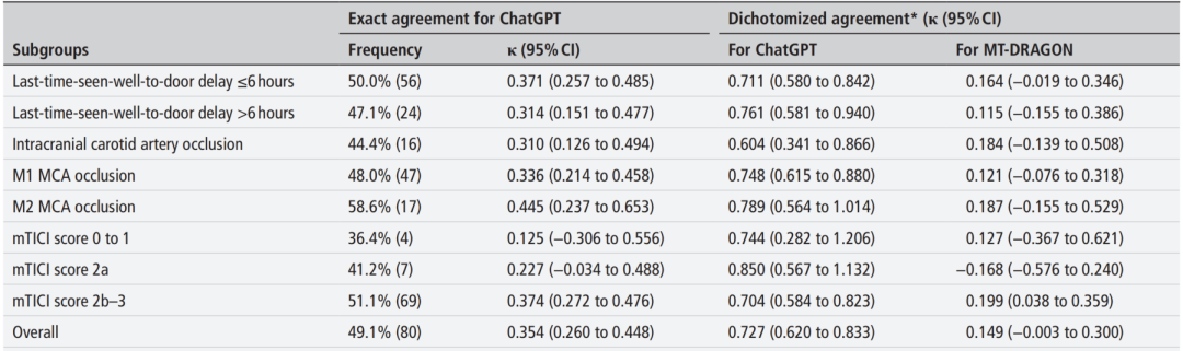 ChatGPT在术后3个月时的精确预测和二分法的mRS评分的一致性分别为一般(κ=0.354,95%CI 0.260至0.448)和良好(κ=0.727,95%CI 0.620至0.833),在总体和亚组预测中均优于MT-DRAGON评分。对于发病到入院时间较短、远端闭塞和改良脑梗死溶栓分级(mTICI)较好的患者,ChatGPT预测的一致性更高。