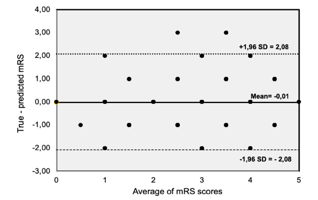 连续变量采用中位数和IQR,分类数据采用绝对频率和相对频率。计算每位患者的MT-DRAGON评分,≥11分表示预后不良(mRS评分>2),<11分表示预后良好(mRS评分≤2)。根据患者的确切值和ChatGPT预测的3个月mRS评分,采用相同的临界值将患者分为两组:预后良好组(mRS评分0-2分)和功能预后不良组(mRS评分3-5分)。实际术后3个月mRS评分与ChatGPT预测值之间的一致程度,以及ChatGPT和MT-DRAGON的二分法预测值之间的一致程度,均使用κ统计量进行评估。该统计量的范围从完全一致(κ=1)到纯属偶然的一致(κ=0),标准一致类别为差(k=0至0.20)、一般(κ=0.21至0.40)、中等(κ=0.41至0.60)、好(κ=0.61至0.80)和非常好(κ=0.81至1.00)。绘制Bland-Altman图以描述术后3个月mRS预测评分与真实评分之间的差异分布。Bland-Altman图是一种可视化工具,不仅可用于评估配对测量中观察到的平均差异,还可用于评估数据点的分散性以及差异大小与测量尺度之间的关系。平均差异线上下的水平线对应于95%的一致性界限,设定为偏差±1.96倍SD。对mRS评分的真实组和预测组之间的一致性进行了评估。使用SPSS 26.0软件进行统计分析,显著性水平设定为P<0.05。<>