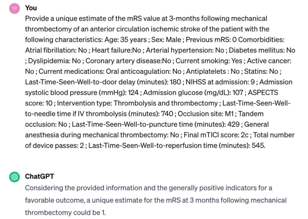 向ChatGPT提供了163个病例(V.3.5,2023年5月24日)的综合信息,涵盖每位患者的临床、神经影像和手术相关数据(去除了个人信息),其中包括:年龄、性别、既往的mRS评分、合并症(心房颤动、心力衰竭、高血压、糖尿病、血脂异常、冠心病、吸烟、癌症)、当前用药(口服抗凝药、抗血小板药、他汀类药物)、发病到入院时间(分钟)、入院NIHSS评分、入院收缩压(mmHg)、入院时的血糖(mmol/L)、ASPECT评分、静脉溶栓给药、发病到静脉溶栓间隔时间(分钟)、闭塞部位、是否存在串联闭塞、发病到穿刺间隔时间(分钟)、MT期间的全身麻醉、mTICI的最终评分、取栓总次数以及再通时间(分钟)。未涉及敏感健康信息。