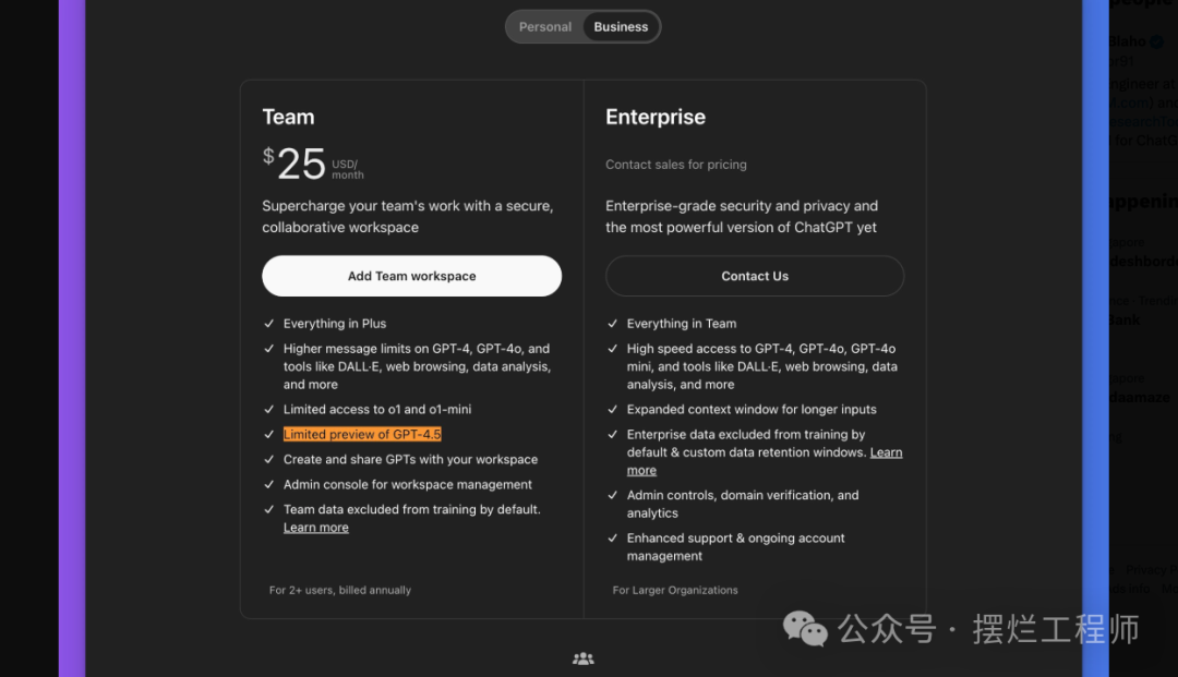 另外,在ChatGPT Team版本上,提到了GPT-4.5,不过目前已经被官方移除,不可见了。估计还是要拖一段时间再开放。