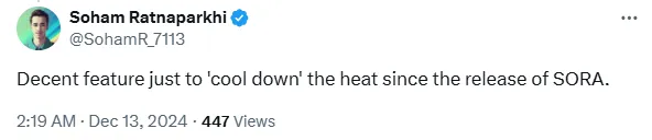 然而,OpenAI第六天的更新也迎来一波网友的吐槽。有网友评价,这次的更新很“无聊”,或许明天会“很疯狂”。也有网友认为,“这只是Sora上线后的一个 ‘降温 ’功能。”