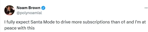 OpenAI高级研究科学家、德扑AI之父Noam Brown甚至称,“我完全相信圣诞老人模式会比 o1 吸引来更多的订阅用户。”