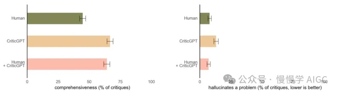 CriticGPT 的建议并不总是正确的,但我们发现它们可以帮助训练员捕捉到比没有 AI 帮助时更多的模型书写答案中的问题。此外,当人们使用 CriticGPT 时,AI 增强了他们的技能,产生的批评比人们单独工作时更全面,比模型单独工作时产生的幻觉错误更少。在我们的实验中,第二个随机训练员超过 60% 的时间更倾向于人类+CriticGPT 团队的批评,而不是未经辅助的人的批评。