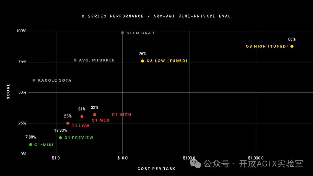 当然,这种通用性的成本很高,而且目前还不是很经济:你可以支付大约每项任务 5 美元的费用让人类解决 ARC-AGI 任务(我们知道,我们这样做了),同时仅消耗几美分的能源。与此同时,o3 在低计算模式下每项任务需要 17-20 美元。但在未来几个月和几年内,性价比可能会大幅提高,因此你应该计划让这些功能在相当短的时间内与人类工作相媲美。