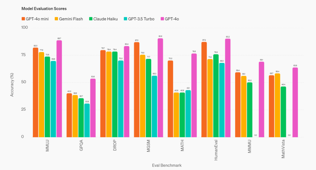 GPT-4o mini在推理基准结果MMLU上得分为 82%,前性价比之王的Claude Haiku得分是73.8%,高出了将近10%的水准。