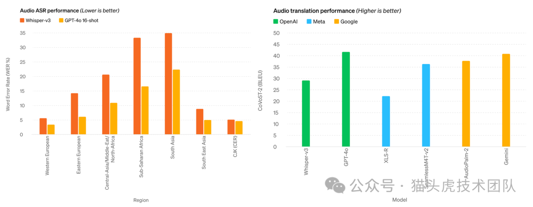 根据自行发布的基准测试,GPT-4o 的表现优于 OpenAI 自己的 Whisper-v3(自动语音识别(ASR)领域之前最先进的技术),并且优于 Meta 和 Google 的其他模型的音频翻译。