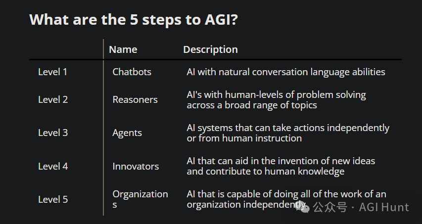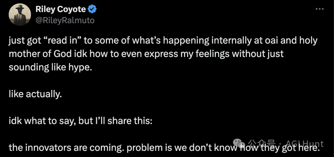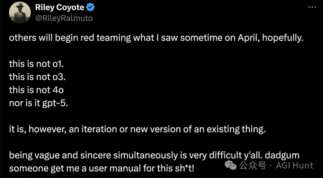 Riley Coyote 在其帖子中提到,OpenAI 正在开发的并非此前传闻中的 o1、o3、o4 或 GPT-5,而是一个“已有事物的迭代或新版本”,这一模糊的描述让外界对 OpenAI 的最新动向充满好奇,有分析人士推测,OpenAI 可能已经达到了 AGI 的第 4 级水平。