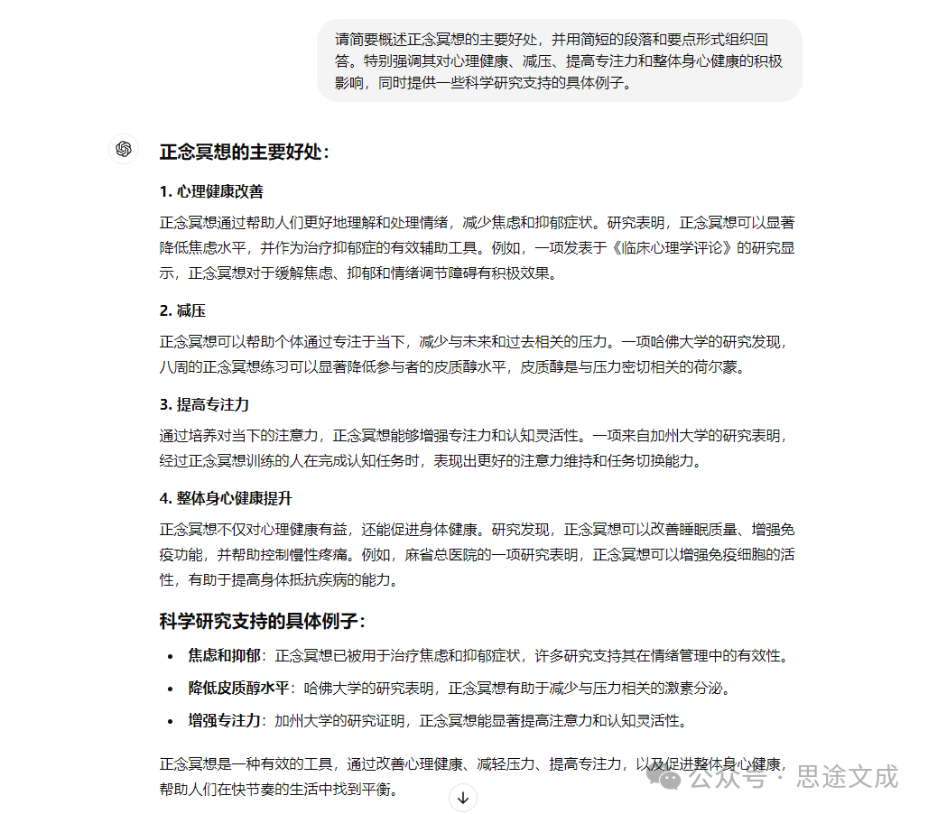 提示清晰地描述了任务,要求 ChatGPT 简要概述正念冥想的好处,并提供了具体的结构要求。