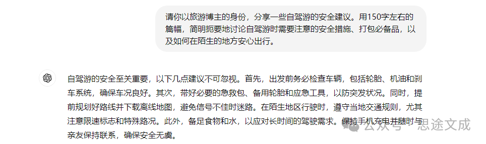 它为 ChatGPT 设定了旅游博主的角色,明确了任务,即分享独自旅行的安全提示。
