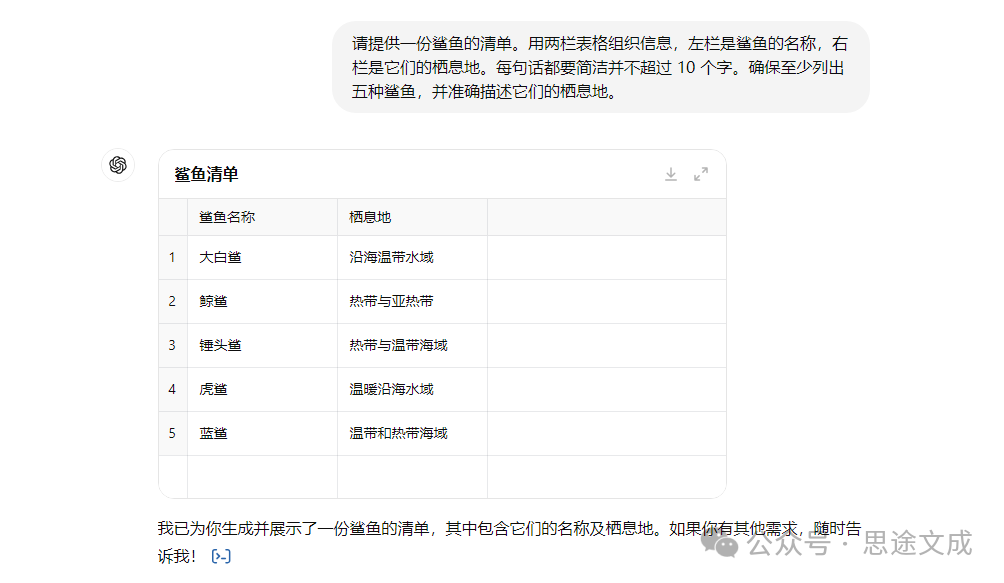 因为它清楚地说明了表格中的内容和句子的字数限制以及要列出的鲨鱼种类。