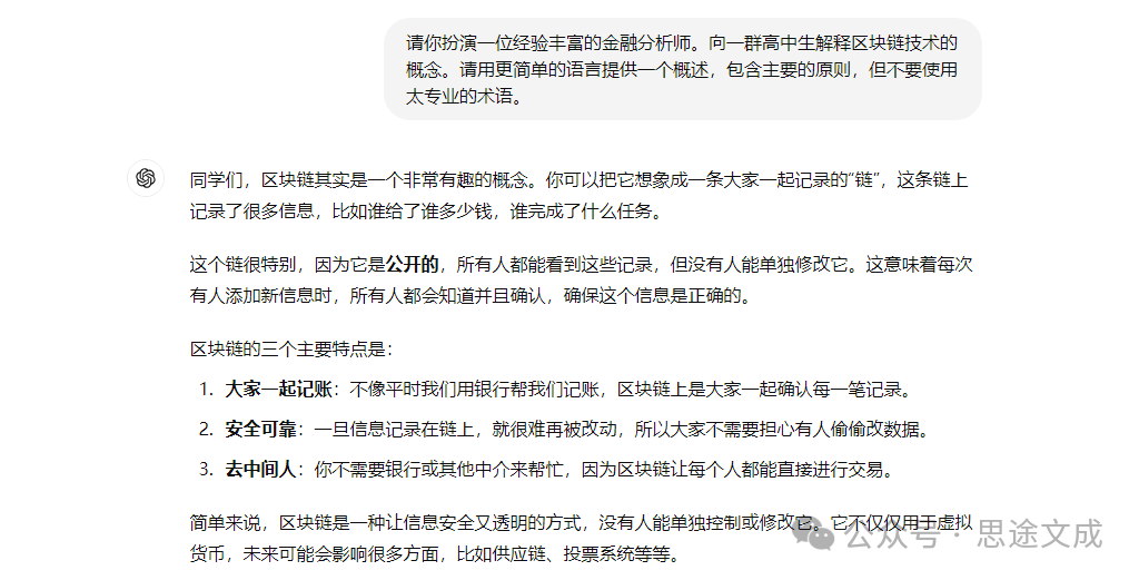 除了上下文和目标,我还建议为 ChatGPT 设定一个角色。比如,你可以让它扮演金融专家或资深文案,这样它会给出更加专业且贴合主题的回答。