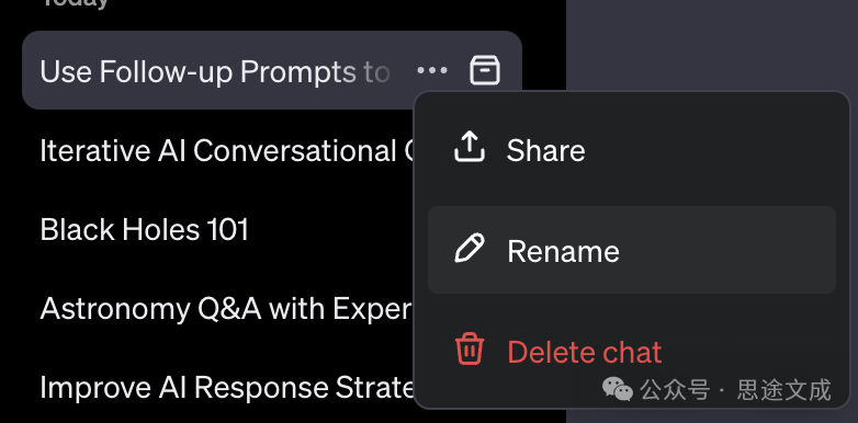 只需点击对话旁边的三个点,再选择“重命名”,你就可以将记录命名为容易查找的名字。这使得你以后能快速找到之前的对话内容。